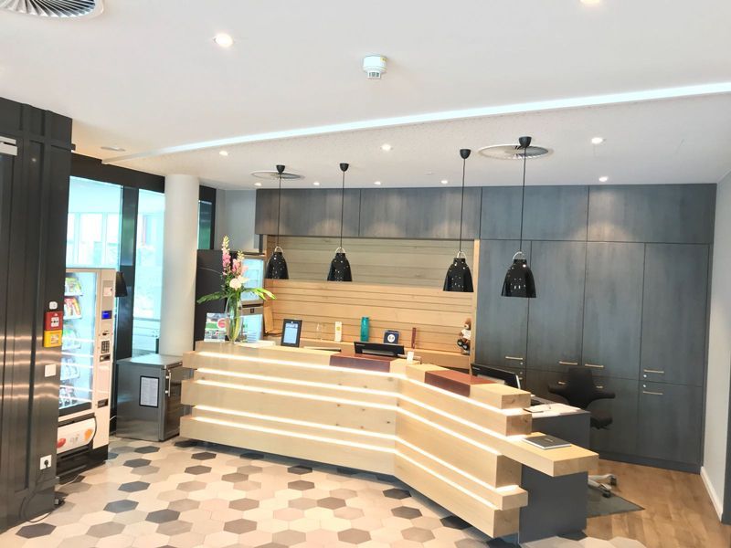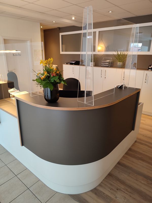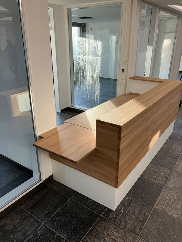 Auch für Gewerbekunden realisieren wir ansprechende Inneneinrichtungen. Oberflächen mit Schichtstoff, Arbeitsplatten und Empfangstresen auf Gehrung gearbeitet sowie Spiegel mit LED-Flexilight Beleuchtung sind nur einige unserer Möglichkeiten.